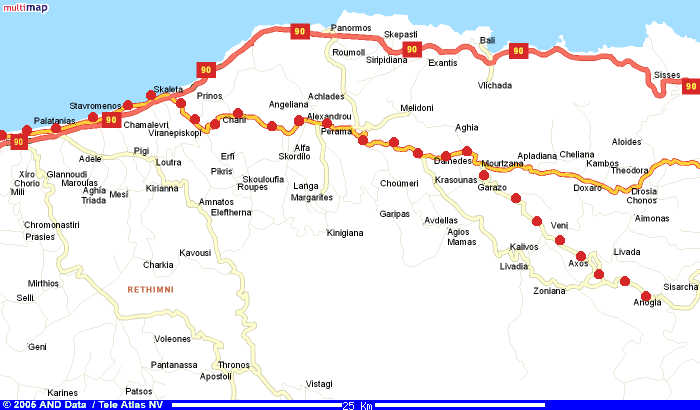 Ich bleibe auf der alten Hauptstraße zuerst entlang der Küstenorte, dann ins Hinterland nach Perama und Moutzana. Die Straße verläuft bei mäßiger Steigung durch eine romantisches Felstal hinter den Küstenbergen. In Moutzana beginnt der Aufstieg nach Anogia. Da ich noch einen Tag Zeit habe, plane ich doch noch zum Fuß des Psilorithis, des höchsten Berges auf Kreta, zu fahren. Heute hängt der Gipfel fast den ganzen Tag in Wolken. Von Anogia (800 m Höhe) geht es nochmals 22 km aufwärts in die Nida-Ebene auf 1400 m Höhe. Dort beginnt der vierstündige Wanderweg auf den Gipfel (2456 m).