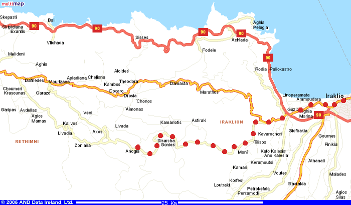 Heute beginnt der endgültige Abstieg ins Tiefland. Zuerst aber muss ich das Rad wieder ans obere Dorfende hinaufschieben. Alle Augen verfolgen neugierig den schwer bepackten Radfahrer. Noch ein frisches Brot vom Bäcker und die Abfahrt kann beginnen. Die Steigungen sind relativ sanft, so dass die vordere Bremse mit den neuen Bremsgummis ausreicht. Hinter Gonies geht es nochmals kurz hoch. Darauf folgt die Straße am oberen Rand einer immer steiler werdenden Schlucht. Am Schluchtausgang öffnet sich der Blick auf die dicht besiedelte Ebene von Heraklion. An den Berghängen wachsen gepflegte Olivenbaum-Kulturen.
