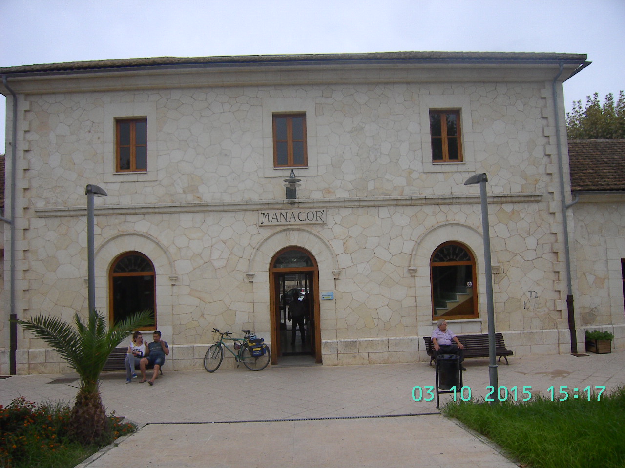 Manacor ist die zweitgrößte Stadt in Mallorca. Zwischen 14:00 und 17:00 ist spanische Siesta. Außer einigen Bars, dem Eroski und LIDL ist alles verrammelt. Auf dem Vorplatz der riesigen Kathedrale mache ich Mittagspause. Dann geht’s zum Bahnhof: Hier endet die Metro M2 von Palma. In Wirklichkeit startet zunächst ein Diesel-Triebwagen, aus dem man unterwegs in den elektrifizierten Zug nach Inca und Palma umsteigen muss. Immerhin wird auch eine Gruppe mit Fahrrädern transportiert.