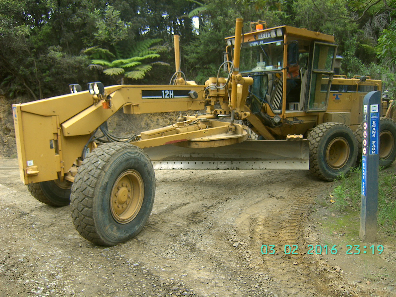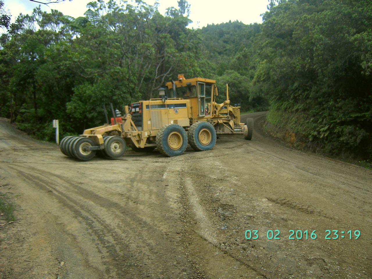 Zunächst ist die Straße asphaltiert. Sie windet sich im Flusstal leicht bergan – sehr europäisch. Nach dem Hinweisschild auf „Gravel Road“ beginnt eine vereinfachte feste Decke aus Bitumen mit Splitsteinchen. An einigen Schlaglöchern erkennt man noch den sandigen Unterbau unter der dünnen Schicht. Die Straße fährt sich gut mit dem Fahrrad. Schließlich geht der Belag in eine glatte, frisch gewalzte Erdschicht über. Im weiteren Verlauf wird die Straße erst frisch hergestellt. Die Erdschicht wird mit dem Caterpillar Grater geformt und leicht gewalzt, dann mit dem Wasserwagen besprüht und sofort mit der Vibrationswalze befestigt. Jetzt fehlt nur noch die Teer-Split-Schicht.