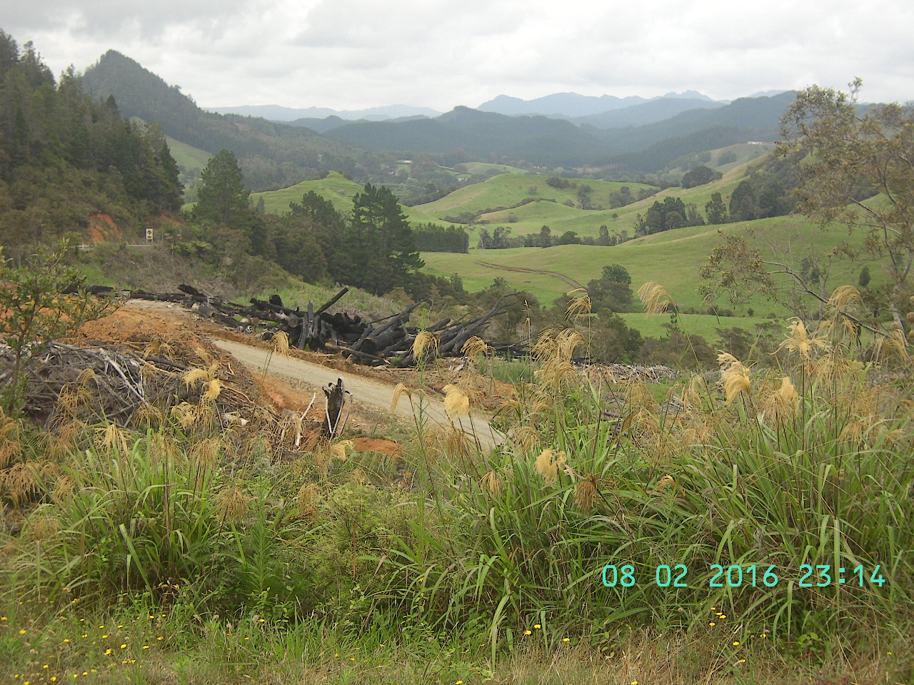 Mein vollbepacktes Rad wird von einigen Mitbewohnern des Hostels bewundert und sogar fotografiert. Ich starte über die gleichen 12 km wie gestern – eine relativ flache Strecke. Danach beginnt aber die Bergfahrt. Mal wieder geht es auf über 300 m hoch – schiebend. Der Verkehr ist gering, weil die Hauptroute nach Auckland über Thames führt. Schwere Logging Trucks – mit bis zu 8 Achsen – ziehen dennoch an mir vorbei – mit angestrengten Motoren. Ich warte jeweils auf dem Seitenstreifen, bis sie vorbei sind.