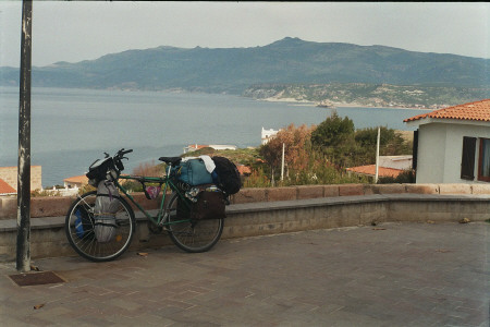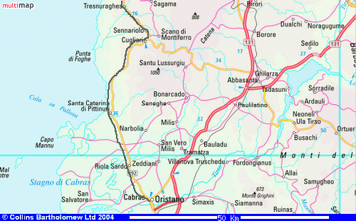 Die Strecke beginnt gleich hinter Bosa Marina bergig auf der Küstenstraße bis Porto Alabe. In einem kleinen Geschäft finde ich endlich die gestern vermisste Sonnenmilch zu einem annehmbaren Preis. Heute wechseln Sonne und Wolken - die Sonne brennt aber schon sehr heftig. Nun folgt der erste heftige Anstieg nach Tresnuraghes auf einem Bergrücken (257 m). Zunächst bleibt die SS 292 auf der Hochebene bis Sennariolo. Danach beginnt der zweite heftige Aufstieg nach Cuglieri (479 m). Im Ort drücke ich das Rad noch bis zur Basilica hoch. Ein märchenhafter Ausblick auf das grüne Sardinien lohnt die Mühen. Am Horizont begrenzt das Meer die hügelige Landschaft. Von Cuglieri folgt eine lang anhaltende 15 km-Abfahrt bis auf Meereshöhe. Kleine, noch verschlafene Küstenorte werden durchquert bis die Straße in die flache Sumpfebene von Oristano mündet. Viele Artischocken werden hier gepflanzt. Einfach so im Feld steht eine hohe Nuraghenburg (Nur. Tradori). Die Landschaft, der verhangene Himel und der zunehmende Gegenwind erinnern an Radfahren in Dänemark. |