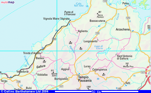 Die Abfahrt nach Valledonia ist lang anhaltend und erfreulich effektiv. Hier setze ich die Mittagspause. Der Hauptverkehr wird vom Ort auf eine fast vollständig pfeilergestützte Umgehungsstraße verlegt. Rauchende Schülerinnen, die nach Schulschluss auf den Bus warten, wecken mich aus dem Mittagsschlaf. Ein letzter Anstieg führt auf den Sattel, auf dem auch Castelsardo liegt. Teilweise muss ich die stark befahrene neue Umgehung nutzen. |
