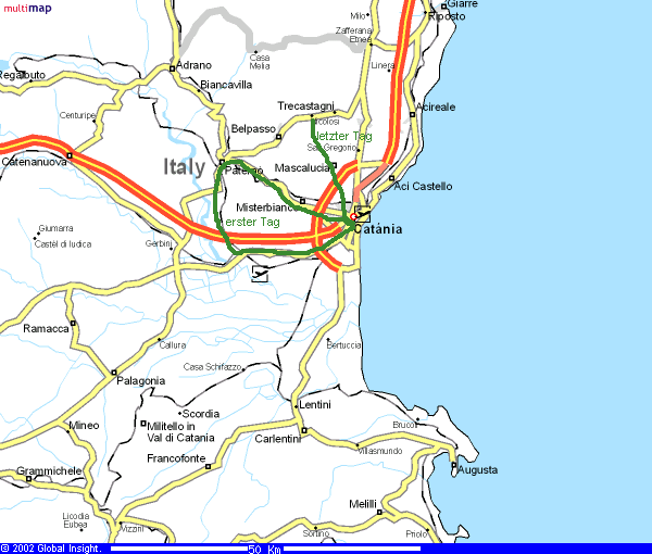 Also fahre ich zurück zur JH, kaufe nochmals ein und genieße das Mittagessen. Zu Fuß gehe ich dann wieder zum FCE-Bahnhof. Die Rundfahrt über 105 km dauert über drei Stiunden und kostet nur 10 DM. Von Giarre Riposto fährt ein Eilzug der FS wieder zurück zum FS-Bahnhof Catania. Von dort laufe ich schließlich wieder zur JH.